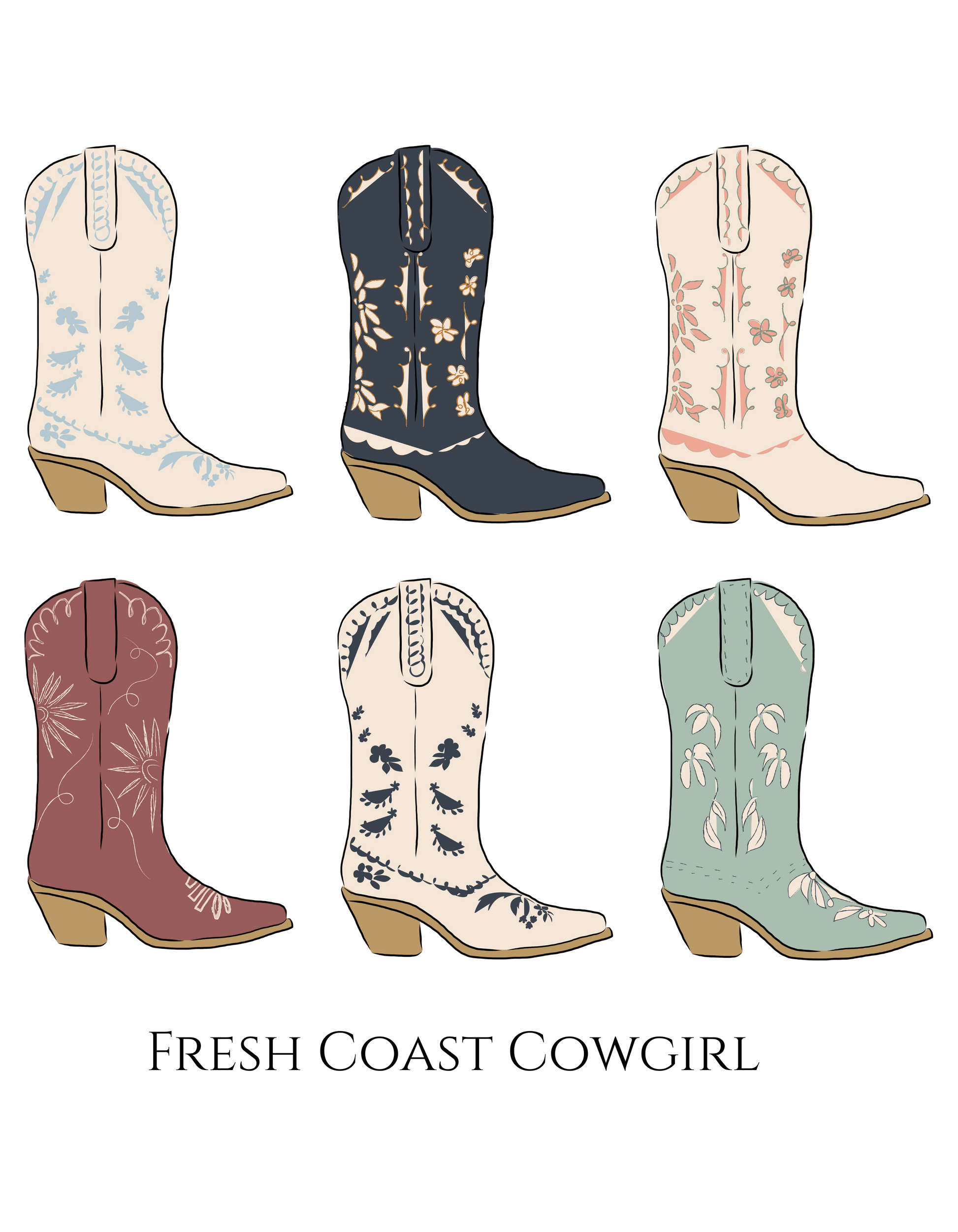 Back Graphic: Six illustrated cowgirl boots + Fresh Coast Cowgirl branding